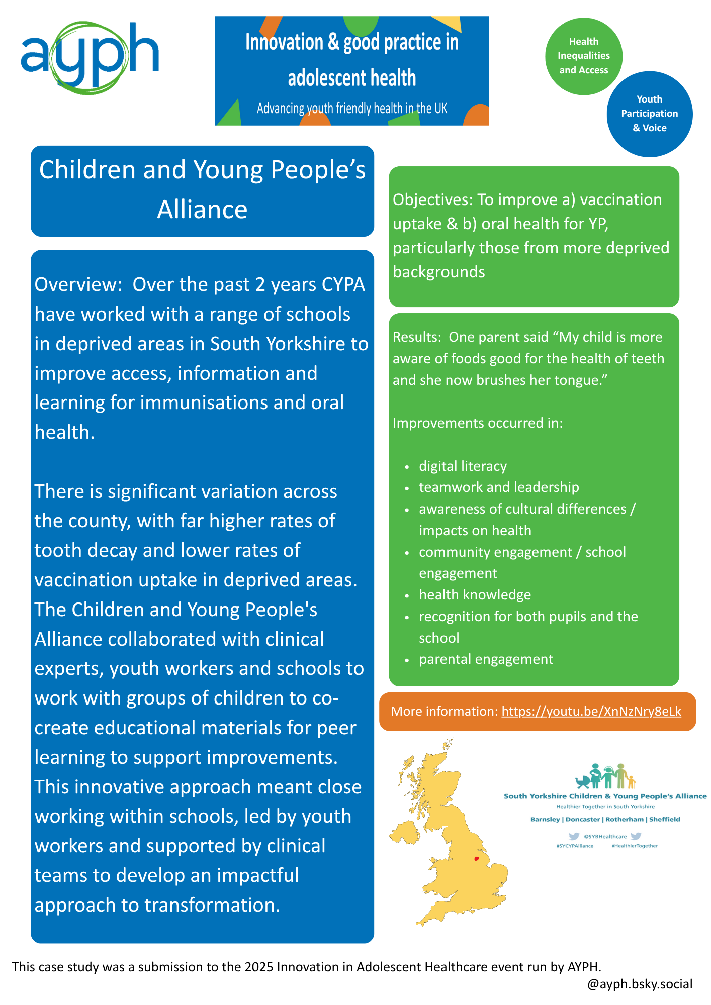 An alliance of organisations working to improve access, information and learning for immunisations and oral health, working with schools, led by youth workers and supported by clinical teams to develop an impactful approach to transformation.