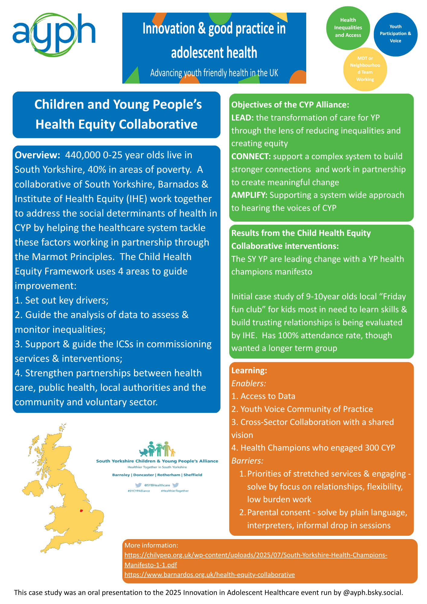 A collaborative of organisations working together to address the social determinants of health in CYP by helping the healthcare system tackle these factors working in partnership through the Marmot Principles.