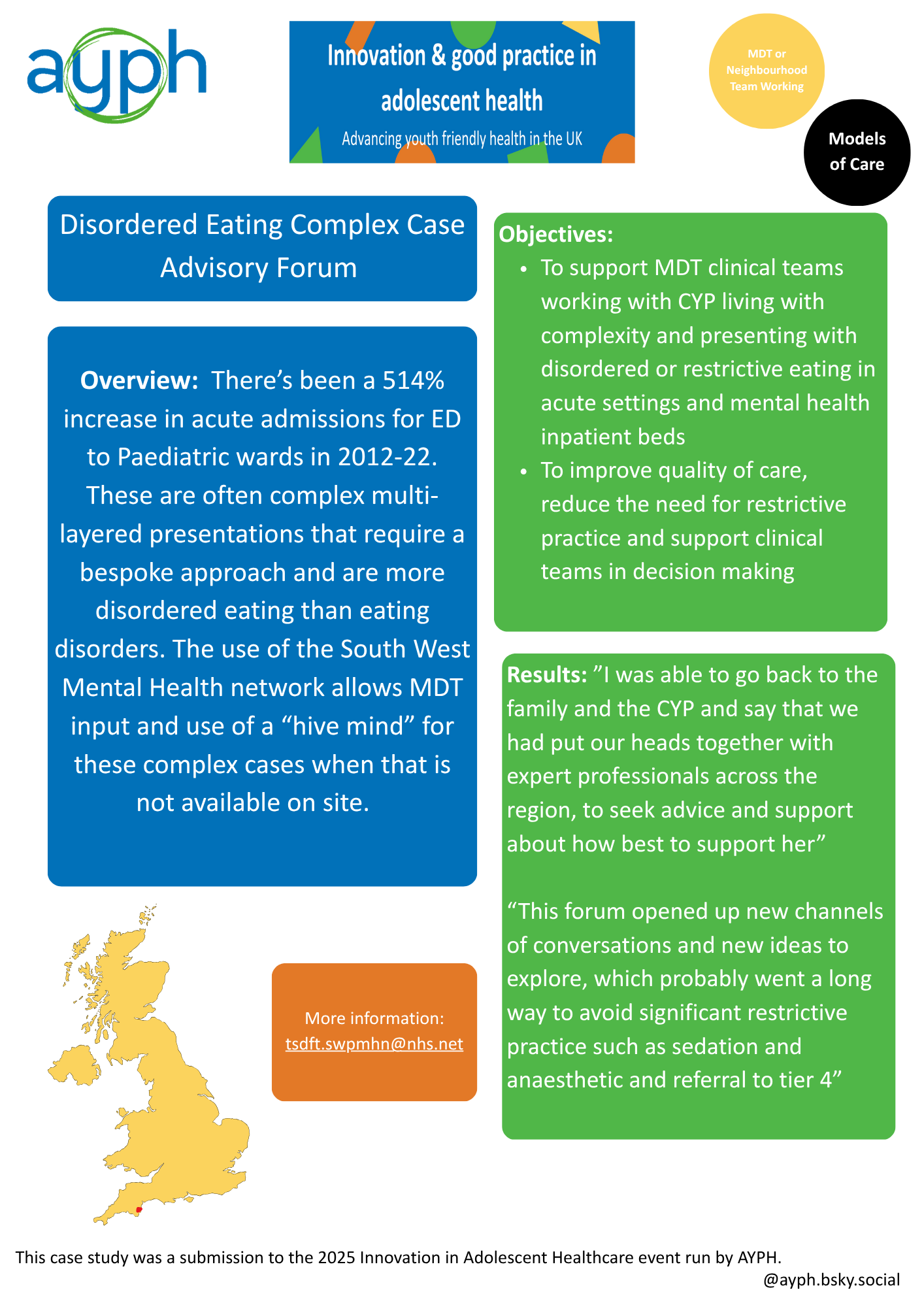 Supporting MDT clinical teams working with CYP living with complexity and presenting with disordered or restrictive eating in acute settings and mental health inpatient beds, to improve quality of care, reduce the need for restrictive practice and support clinical teams in decision making