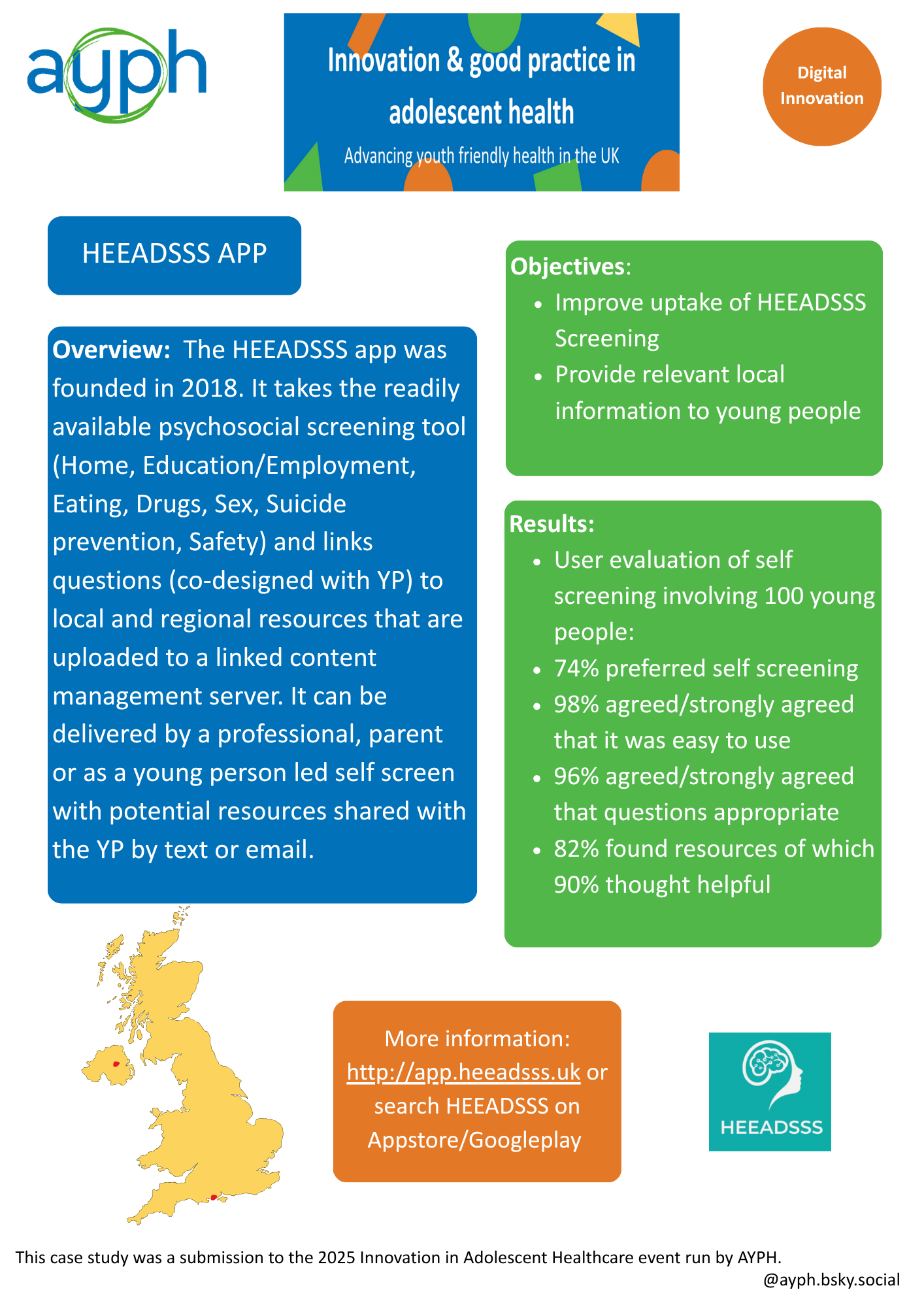 The HEEADSSS app is a psychosocial screening tool (Home, Education/Employment, Eating, Drugs, Sex, Suicide prevention, Safety) and links
