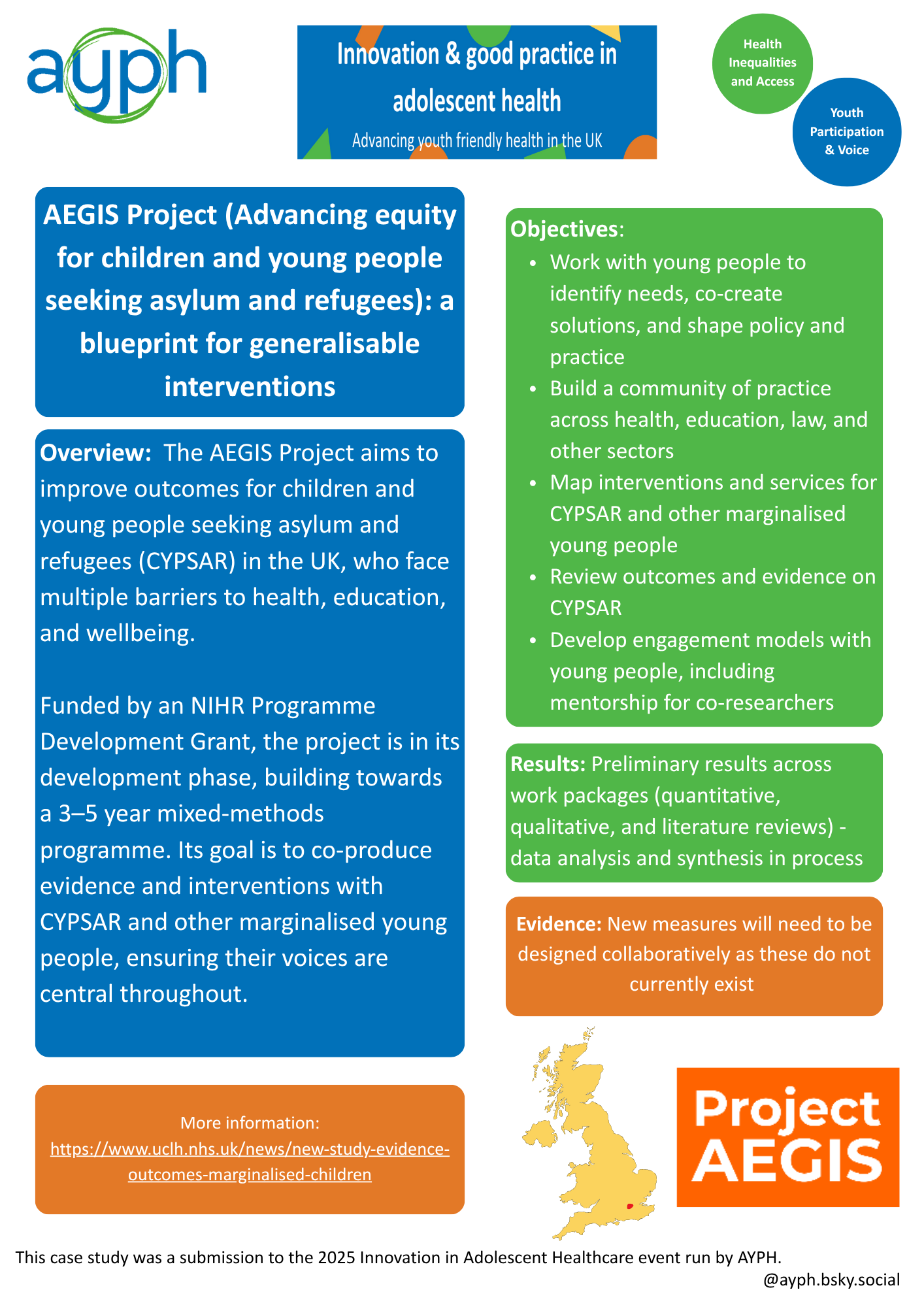 The AEGIS Project aims to improve outcomes for children and young people seeking asylum and refugees (CYPSAR) in the UK, who face multiple barriers to health, education, and wellbeing by co-producing evidence and interventions with CYPSAR and other marginalised young people, ensuring their voices are