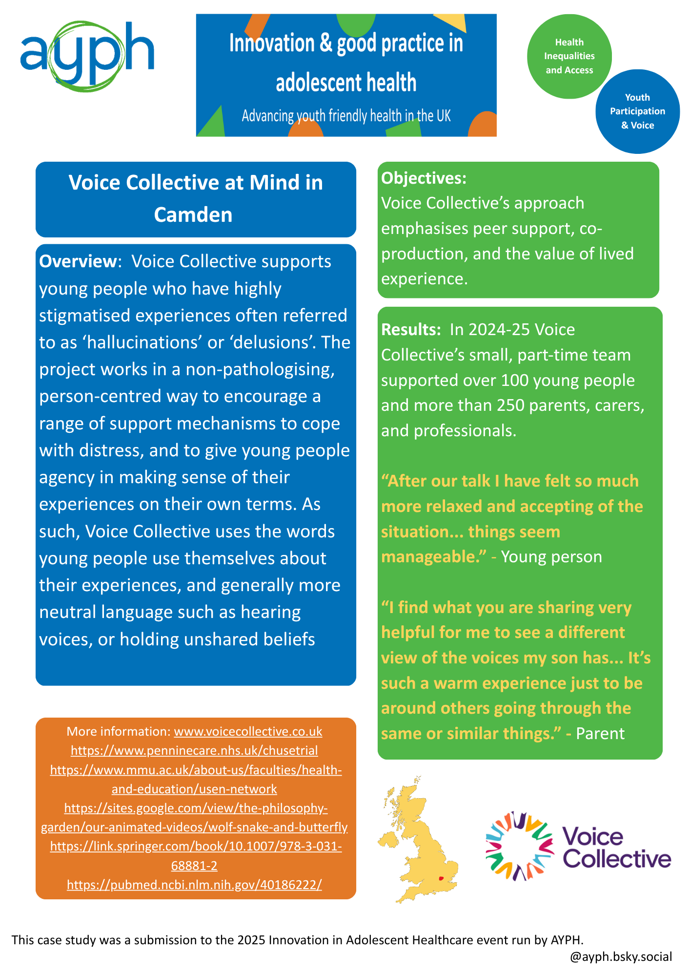 Voice Collective supports young people who have highly stigmatised experiences often referred to as ‘hallucinations’ or ‘delusions’. The project works in a non-pathologising, person-centred way to encourage a range of support mechanisms to cope with distress, and to give young people agency in making sense of their experiences on their own terms.
